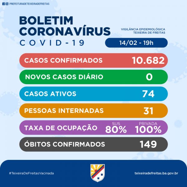 Nesta data, a Secretaria de Saúde de Teixeira de Freitas informa que não houve registro novos casos positivados. Até o momento são 10.682 casos confirmados. Destes, 74 são considerados ativos. Até o momento são 149 mortes. A taxa de letalidade em Teixeira de Freitas é de 1,36%, em relação aos casos confirmados.